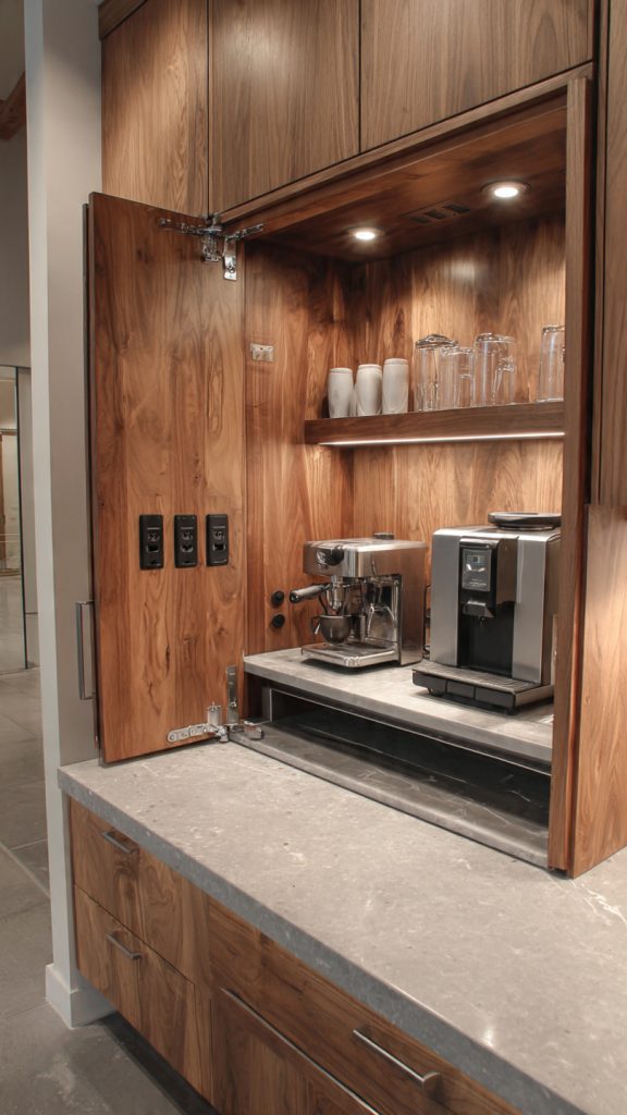 Instead of one large cavity, designers often include shelves inside appliance garages. This keeps smaller items like mugs, filters, and accessories organized.
