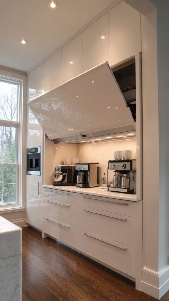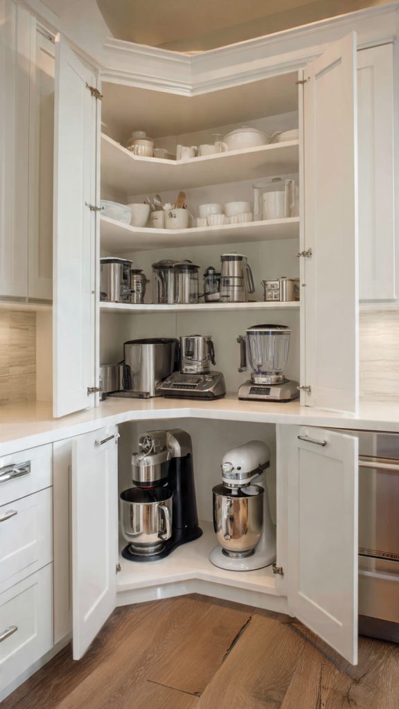 Corners are often underused in kitchens. A corner appliance garage turns this awkward space into a functional storage zone for bulky appliances.