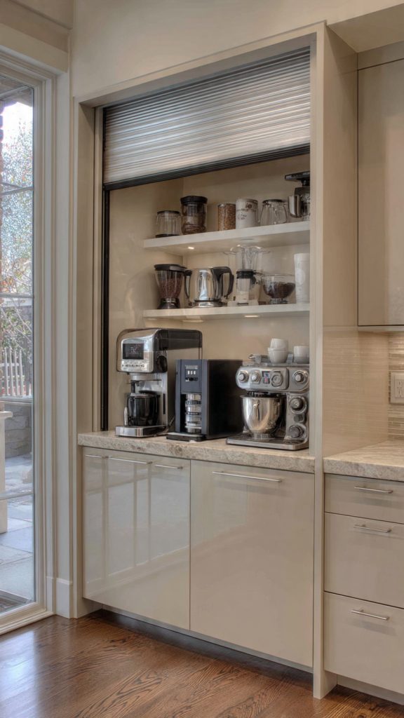 Coffee setups are one of the biggest counter clutter culprits. A shallow appliance garage dedicated to coffee makers and accessories keeps everything contained without taking much space.