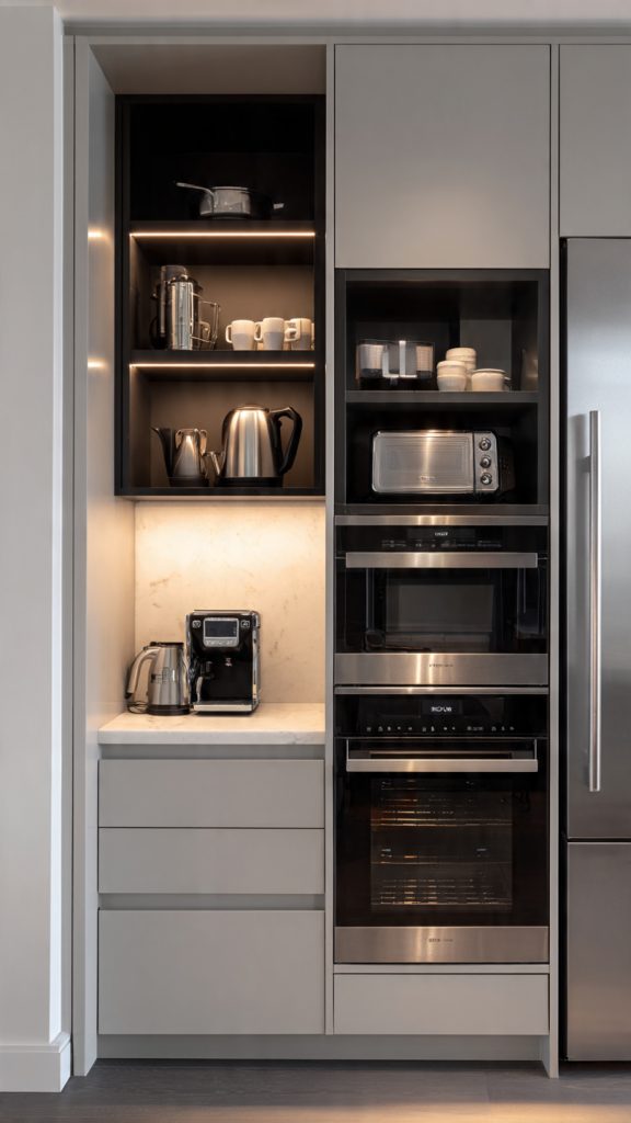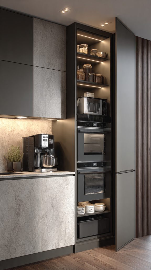 Instead of using counter space, designers often integrate appliance garages into tall pantry cabinets. This keeps counters clear while still keeping appliances easy to reach.