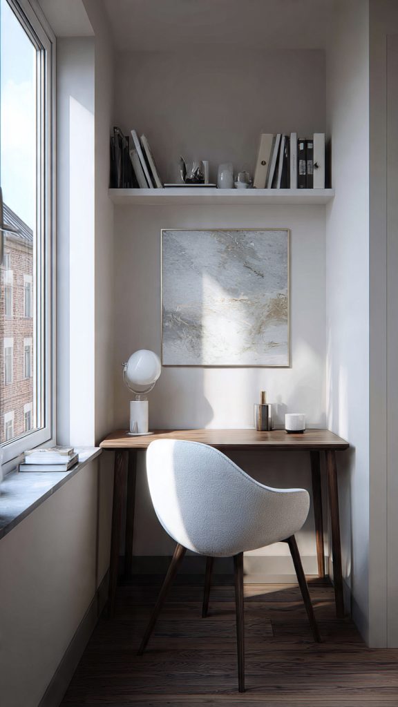 An awkward corner can become a compact workstation with a small desk or wall-mounted surface. Even a shallow desk is enough for a laptop or notebook.