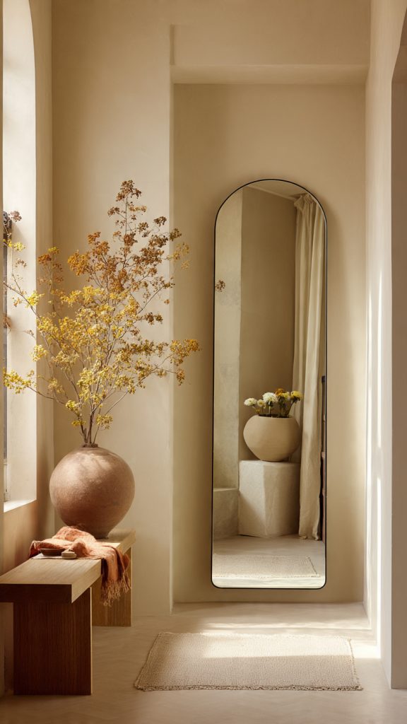 A mirror placed in an awkward corner reflects light and visually expands the room. Tall mirrors are especially effective in narrow or dark areas.