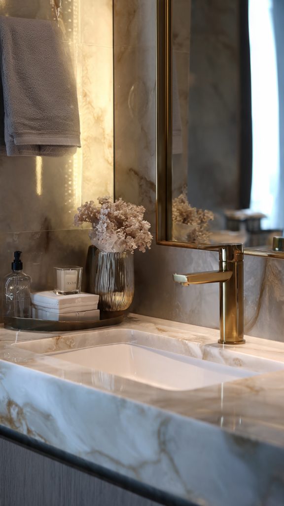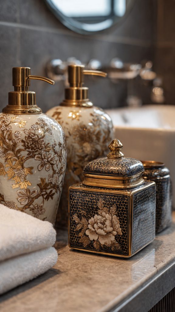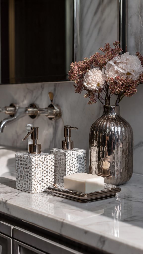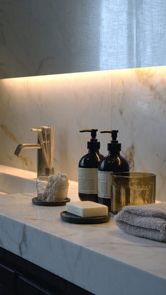 Luxury bathrooms often rely on symmetry. Matching trays, dispensers, or accessories on either side of the sink create balance and polish.