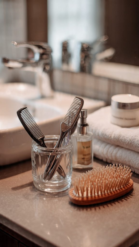 Bathroom counters collect clutter fast. Skincare bottles, hair tools, toothbrushes, and daily essentials quickly turn a beautiful bathroom into a busy one. The challenge isn’t removing everything—it’s organizing what stays so it still looks intentional and luxurious.