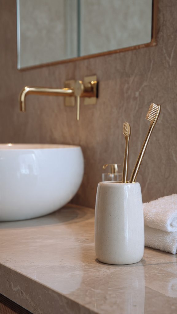 Open toothbrush cups can look messy. Designers prefer sleek holders or enclosed containers that feel intentional and clean.