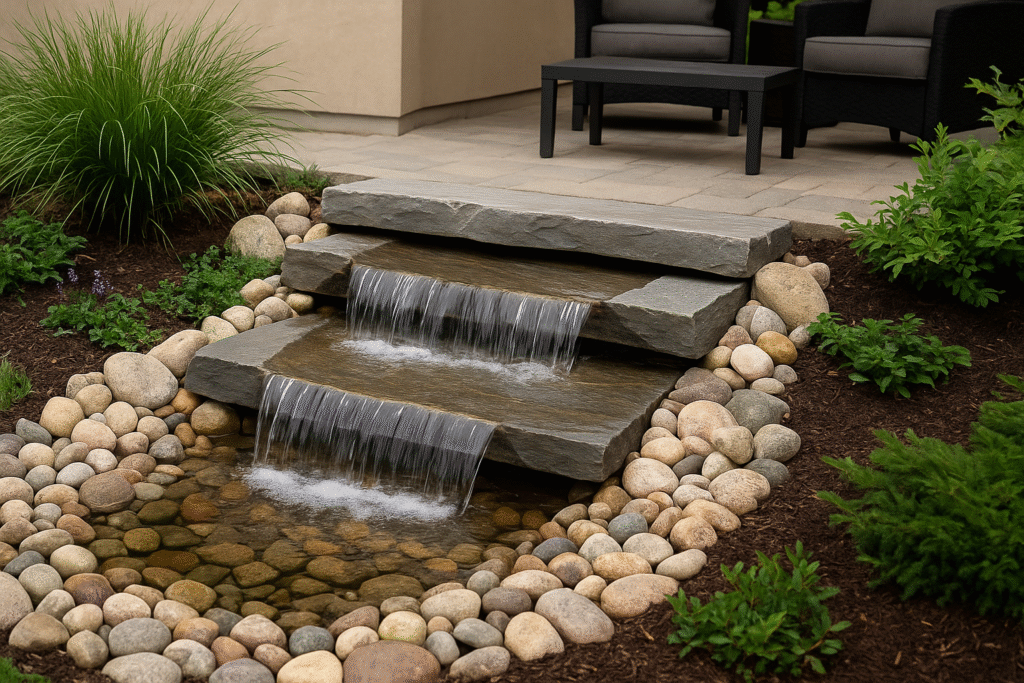 A minimalist pondless waterfall beside your patio can be the perfect backdrop for outdoor gatherings or quiet mornings. Smooth stone layers allow water to cascade in a gentle, glassy flow that pairs beautifully with clean lines and contemporary furniture. Add subtle lighting beneath the spillway to enjoy the calming shimmer well into the evening.