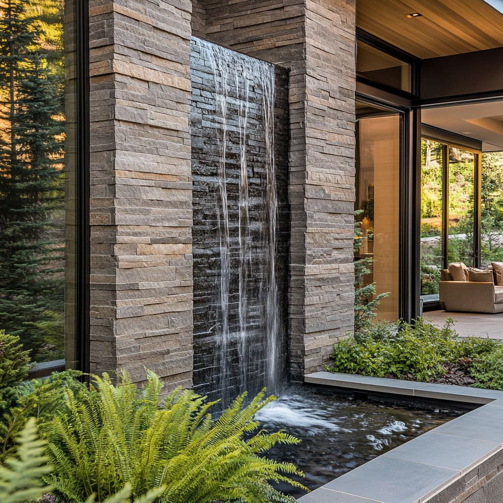 Sometimes, less is more. A sleek, linear waterfall with smooth, flat stones or slate tiles can bring balance to modern homes. Instead of the wild energy of natural cascades, this design focuses on rhythm and reflection. The sound is softer, the lines cleaner — perfect for meditative gardens or spaces meant for rest.