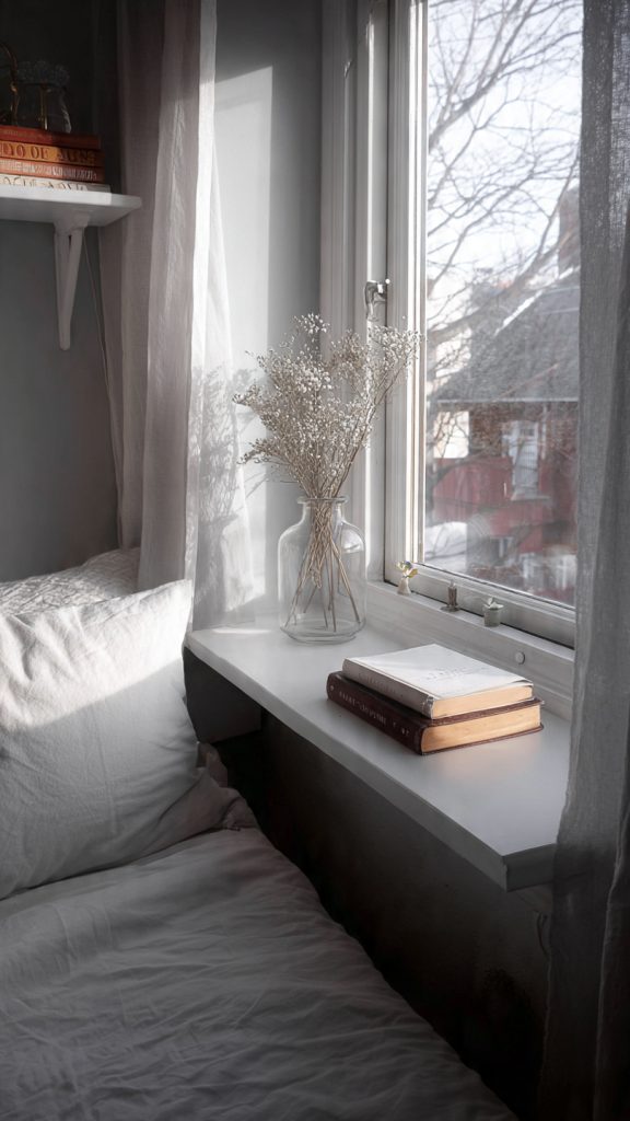 When a bed sits near a window, designers often use the window ledge as a bedside surface. This avoids adding extra furniture entirely.