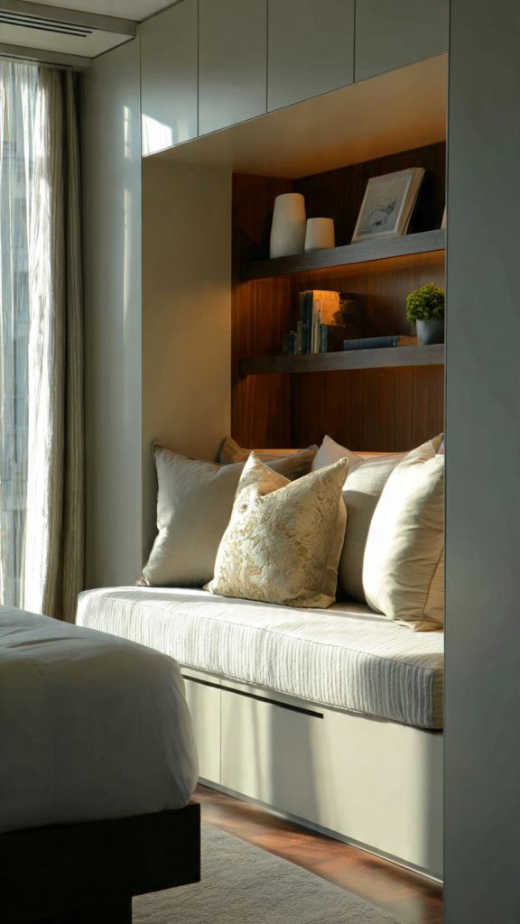 In small bedrooms, traditional bedside tables can feel bulky and unnecessary. They take up precious floor space and often become clutter magnets rather than functional furniture. Designers frequently replace bedside tables with lighter, smarter alternatives that keep essentials close without crowding the room.