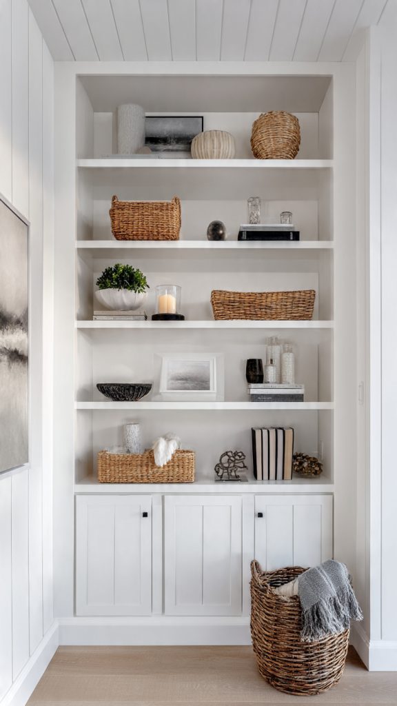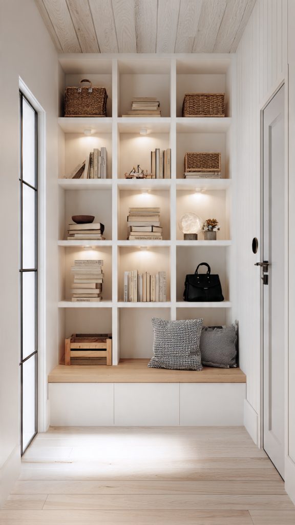 Hallways, entryways, and landings are often overlooked, but built-in shelving can turn these transitional spaces into functional storage zones.