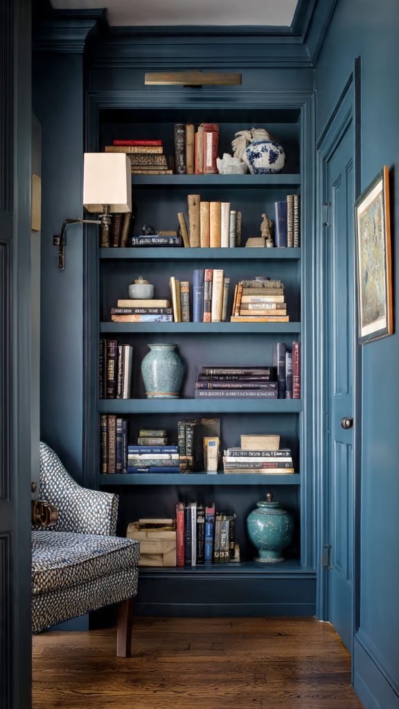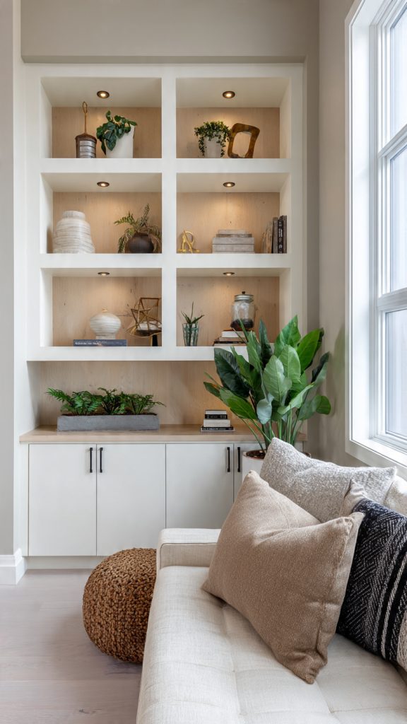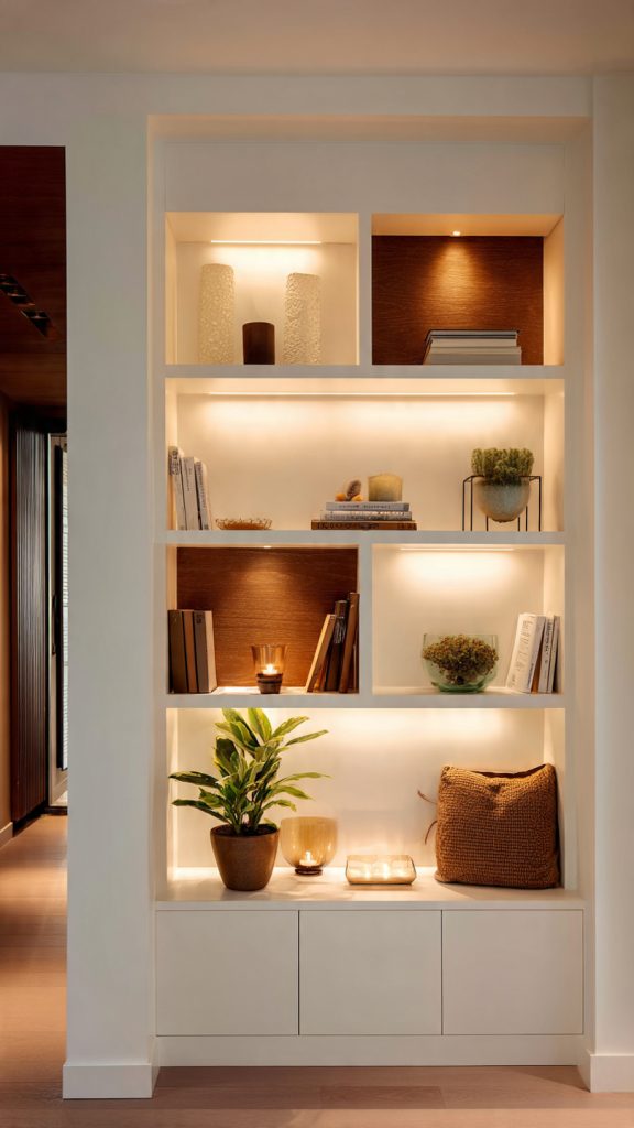 Adding lighting to built-in shelving instantly elevates the design. LED strips, puck lights, or concealed lighting make shelves feel intentional and high-end.