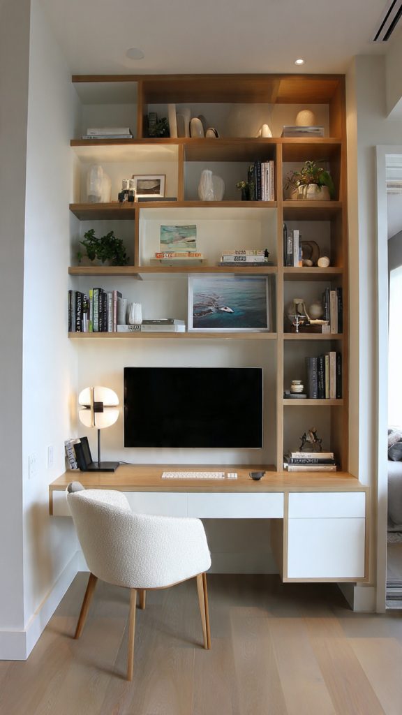 Built-ins that wrap around a sofa or bed make small rooms feel cohesive and well planned. Instead of relying on separate side tables or bookcases, shelving becomes part of the layout.