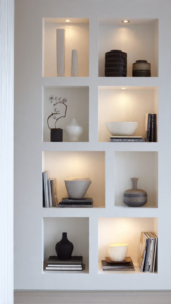 Recessed shelves look best when evenly spaced and thoughtfully styled.