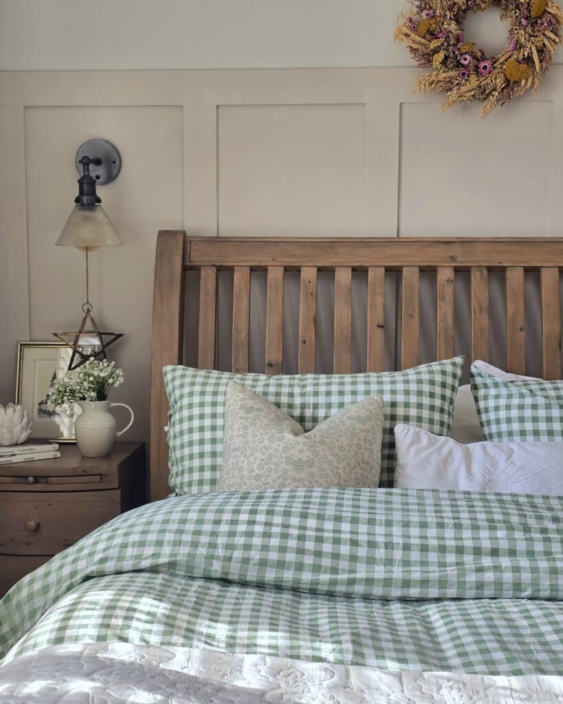For a country-inspired look, opt for sage green gingham or plaid bedding. These patterns add charm and a subtle sense of nostalgia to the space.