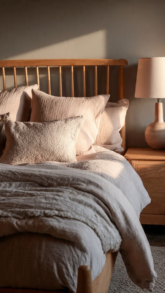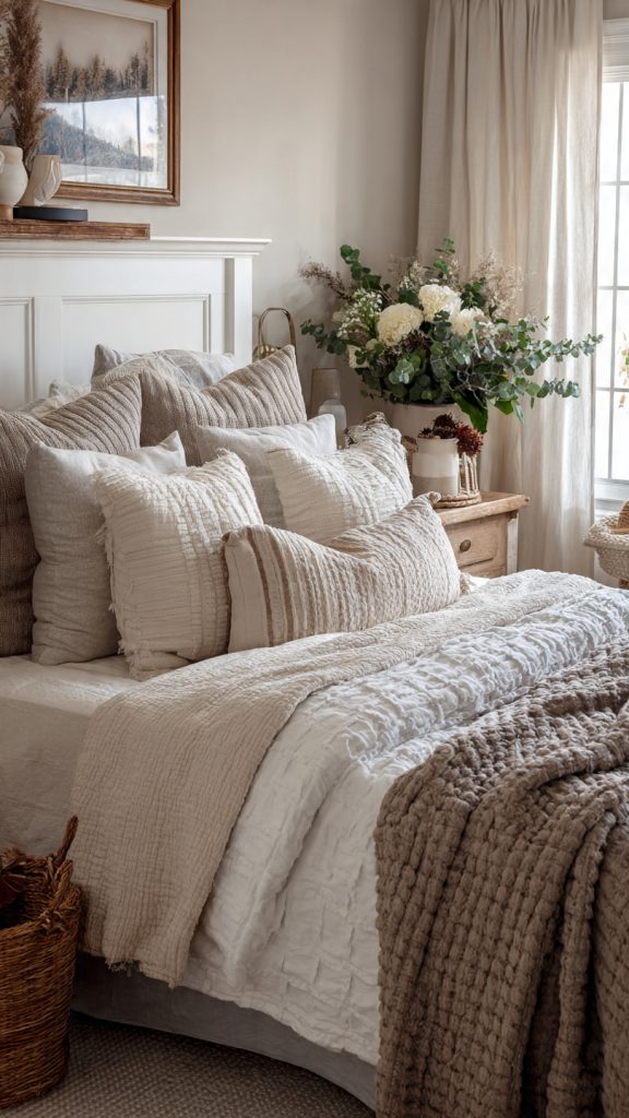 Layered neutrals create visual softness and a cozy feel without introducing visual noise.