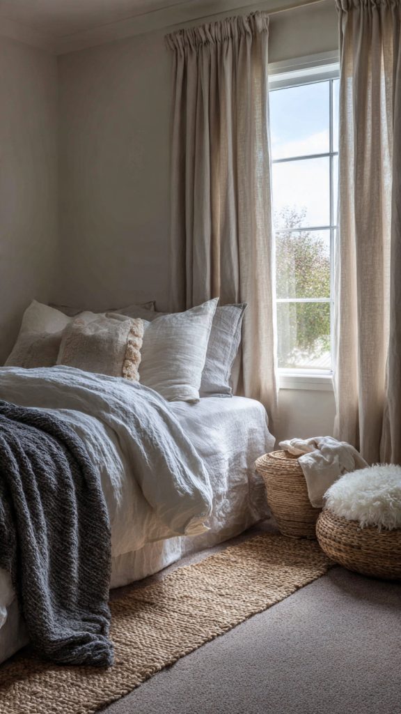 Incorporate linen curtains, cotton sheets, wool throws, or woven rugs to introduce texture without bold color.