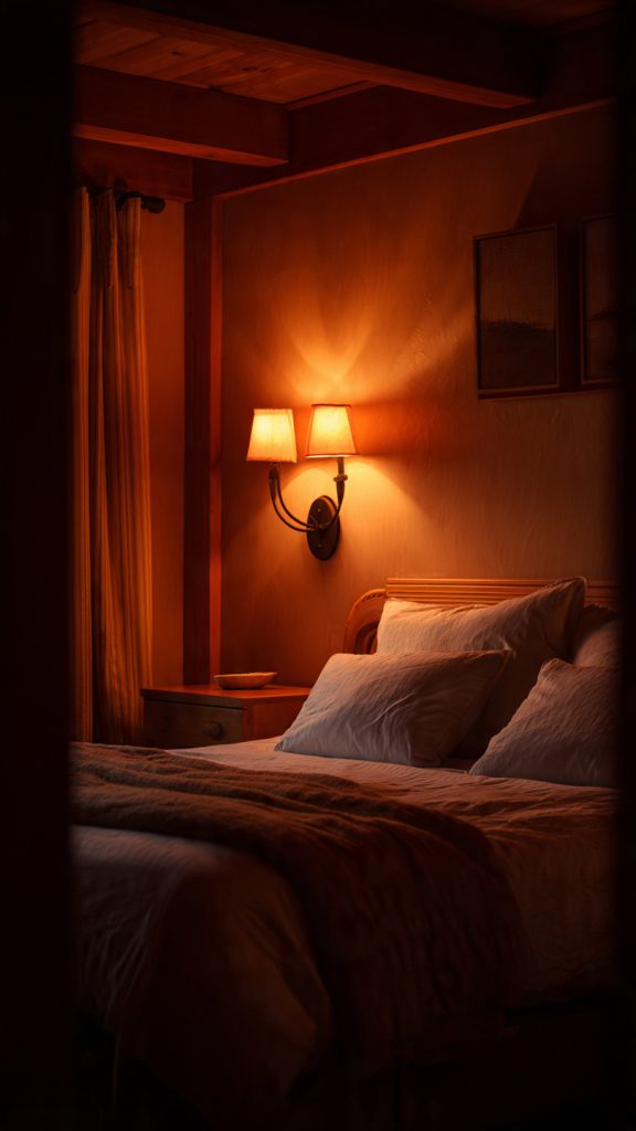 Warm lighting enhances the cozy cottage feel and makes the bedroom more inviting in the evenings.