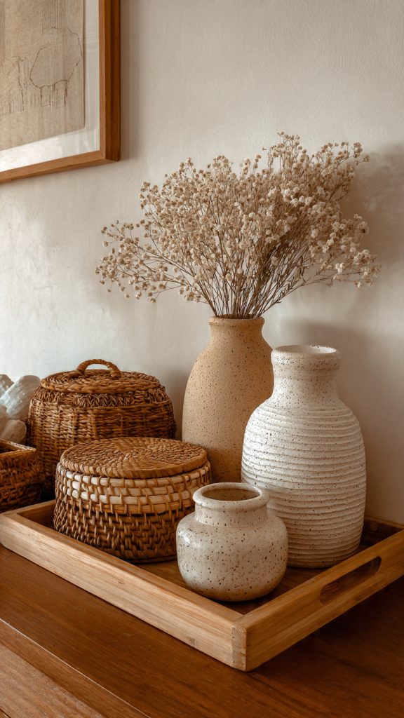 Use simple decor like ceramic vases, wooden trays, woven baskets, or dried florals to add character.