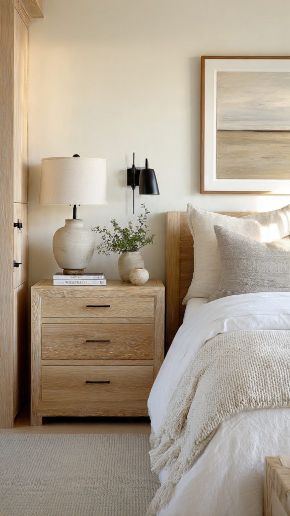 Light wood adds warmth and character while keeping the bedroom feeling fresh and uncluttered.