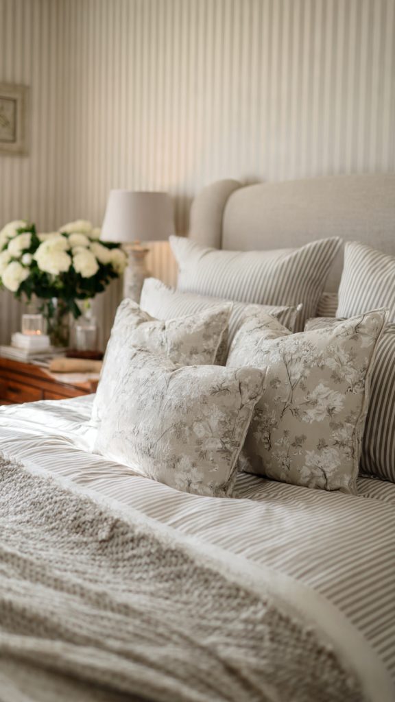 Minimal patterns maintain visual calm and prevent the bedroom from feeling dated.