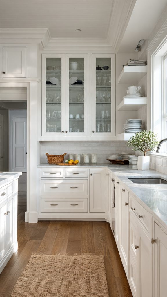 If you use open shelves, keep them sparse with everyday items like bowls, mugs, or glassware in neutral tones.