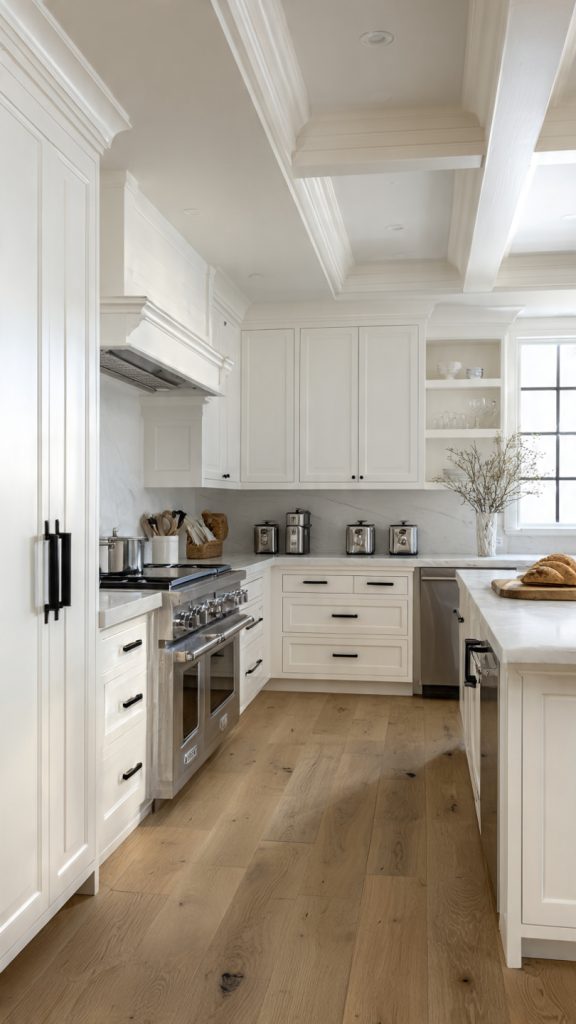 Incorporate wood through open shelving, a kitchen island, or simple stools rather than covering every surface.