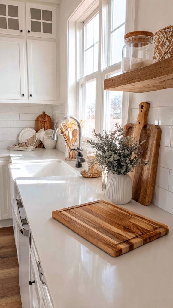 Limit countertop decor to a few functional pieces such as a cutting board, utensil crock, or small tray.