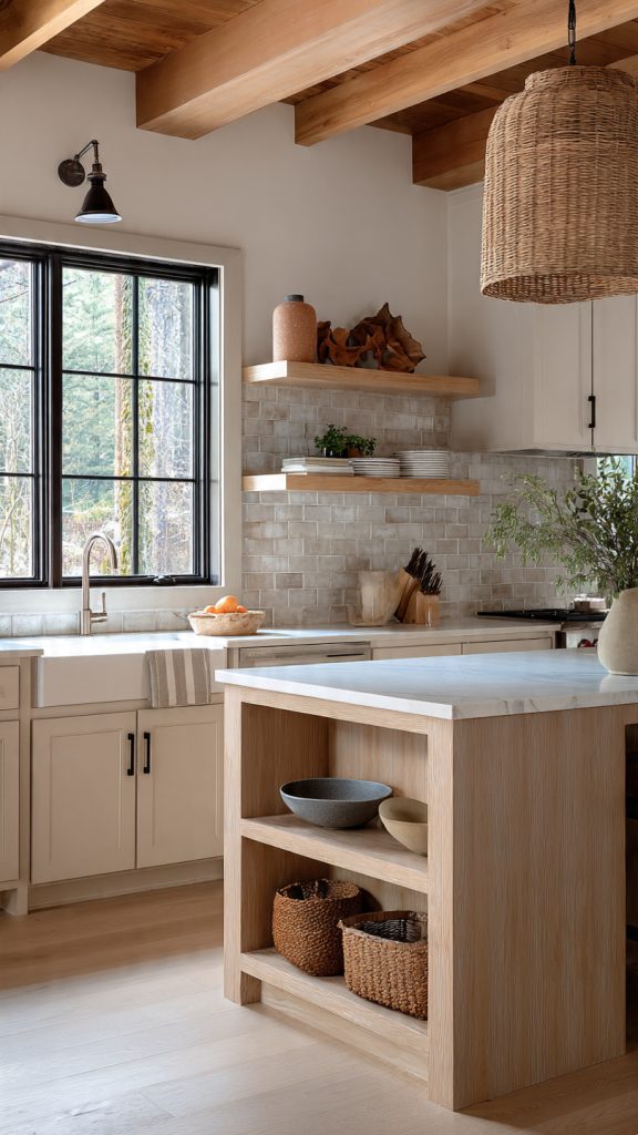 Add texture through stone countertops, tile backsplashes, woven stools, or linen window treatments.