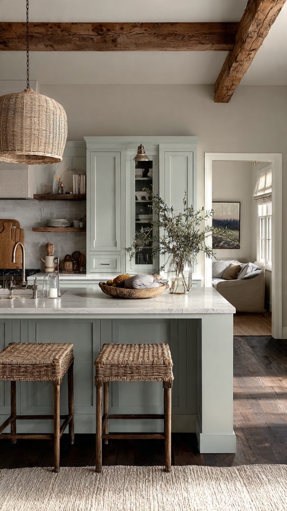Use subtle color accents such as sage green, warm clay, or dusty blue through accessories or textiles.
