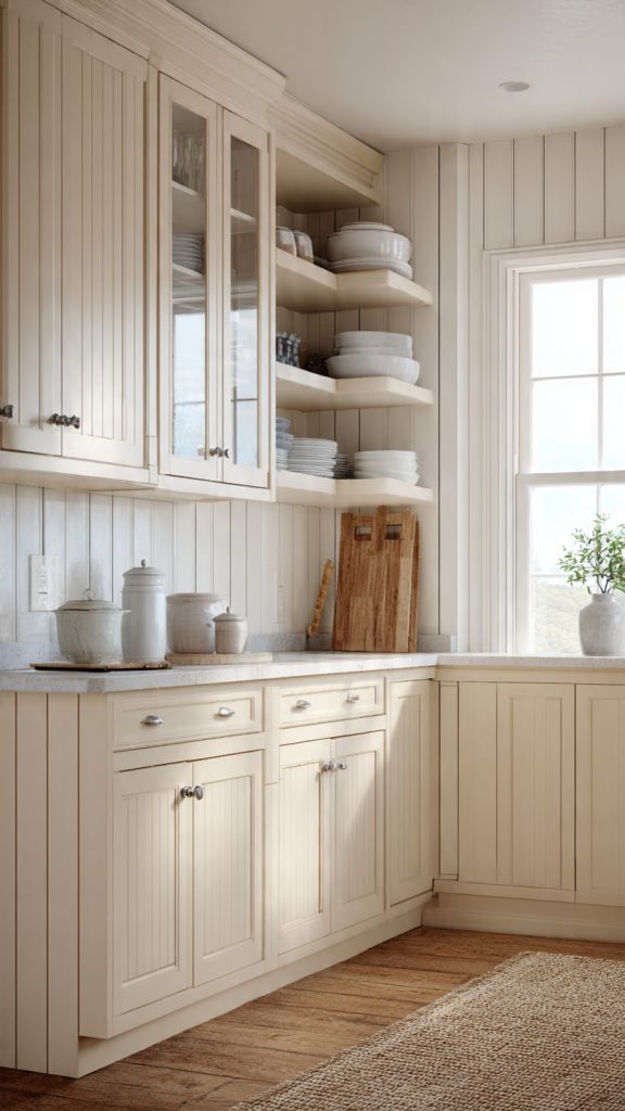 Choose cabinet colors like warm white, creamy beige, soft greige, or muted taupe instead of bright white or dark finishes.