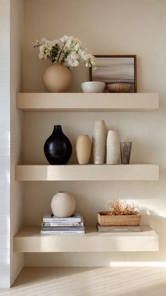 By focusing on color cohesion, spacing, and restraint, these 10 floating shelf styling ideas help create shelves that feel calm, intentional, and beautifully balanced.