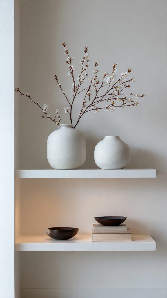 A single organic element—such as a small plant, branch, or textured object—softens the shelf and adds warmth without clutter.