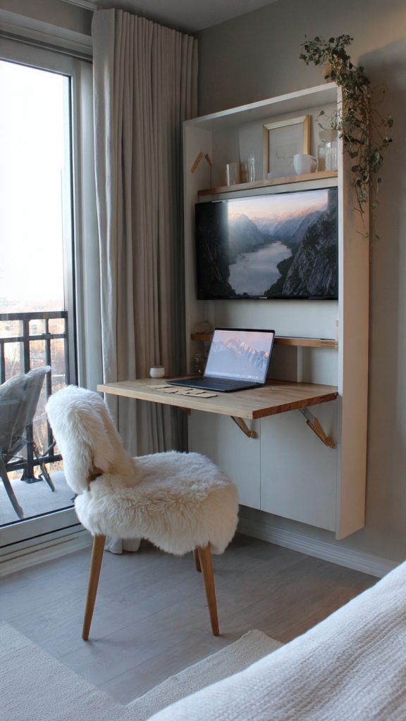 In small homes, the bedroom often doubles as a workspace. A fold-down desk allows the room to shift between rest and work without feeling cluttered.