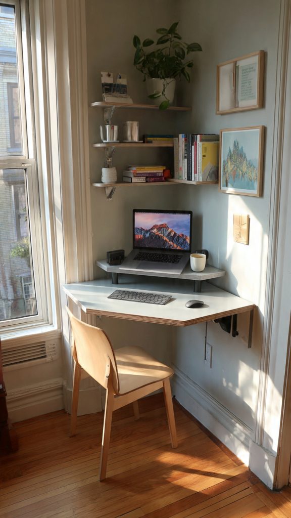 Corners often go unused in small homes. A fold-down desk designed specifically for a corner transforms dead space into a functional workstation without crowding the room.