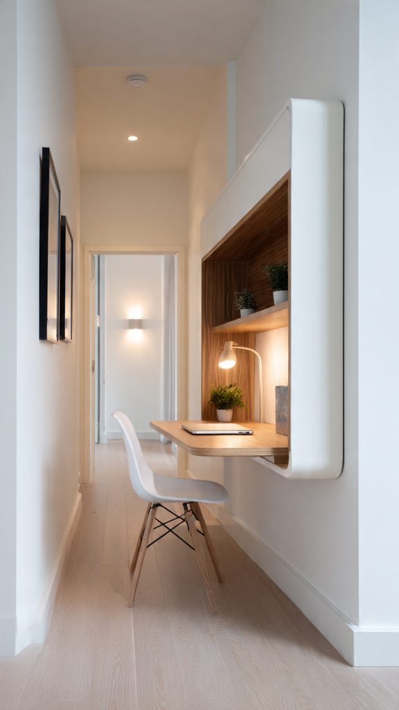 In hallways or tight corners, a slim fold-down desk provides just enough surface for a laptop or notebook without overwhelming the space.