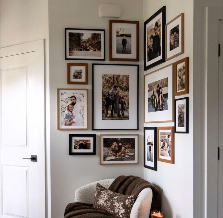 Transform your corner into a mini gallery by creating a corner gallery wall. Mix framed photos, prints, and small mirrors. This adds depth, personality, and a sense of completion to your living space.