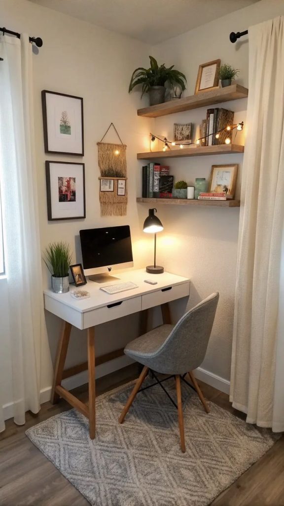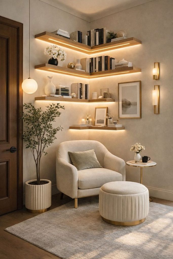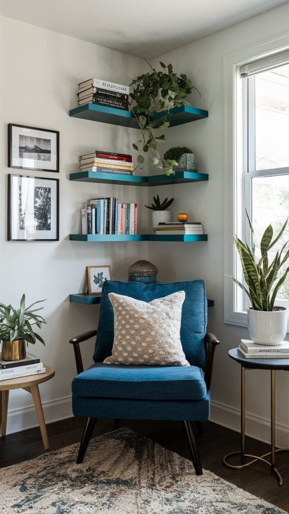 Floating shelves can instantly make a corner feel curated. Display books, plants, and decorative objects in different heights and textures. Mixing personal touches like framed photos or souvenirs adds a lived-in feel.