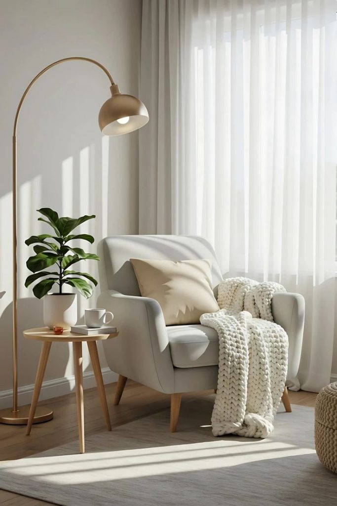 If your corner is dark, a floor lamp paired with an accent chair can create a cozy reading nook. Choose a lamp with an interesting design or brass/gold accents for an elegant touch.