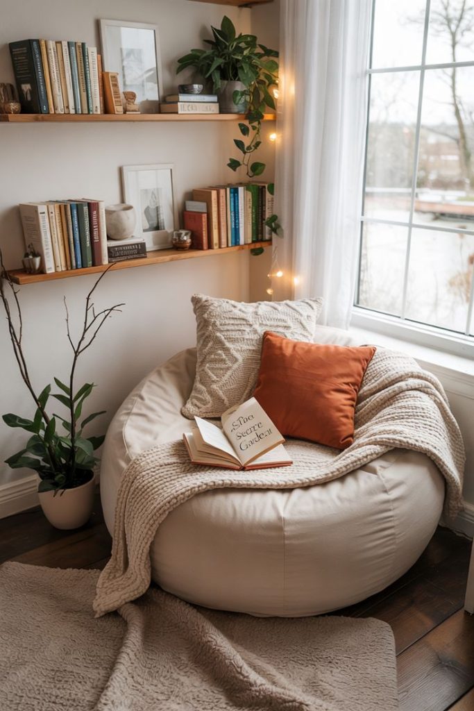 Layer a small rug with a couple of poufs or floor cushions to create a relaxed reading or lounging nook. Add a throw and a floor lamp, and suddenly your corner feels inviting and finished.