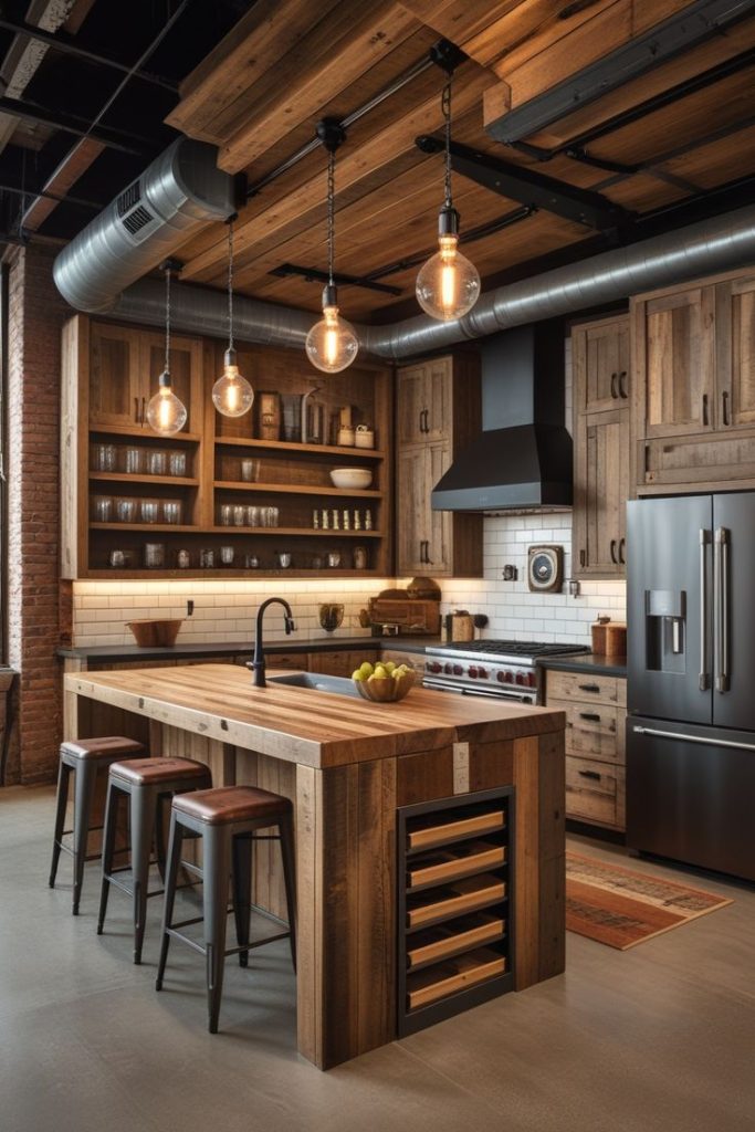 Swap out cold, metal-toned cabinetry for warm wood finishes. Oak, walnut, or maple cabinets add richness and texture, softening the industrial edge of loft spaces.
