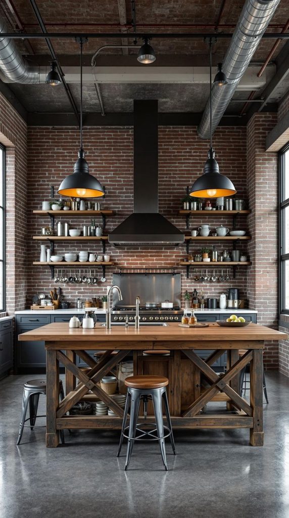 Open shelves can showcase your personality while softening the rawness of a loft. Display warm-toned dishes, cookbooks, and plants to make the space feel lived-in.