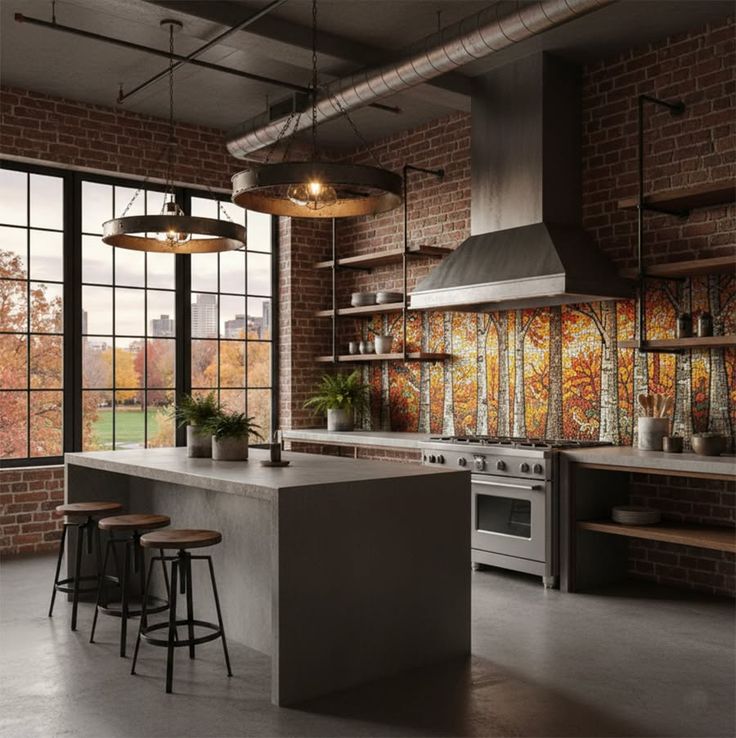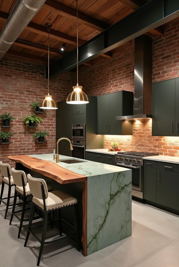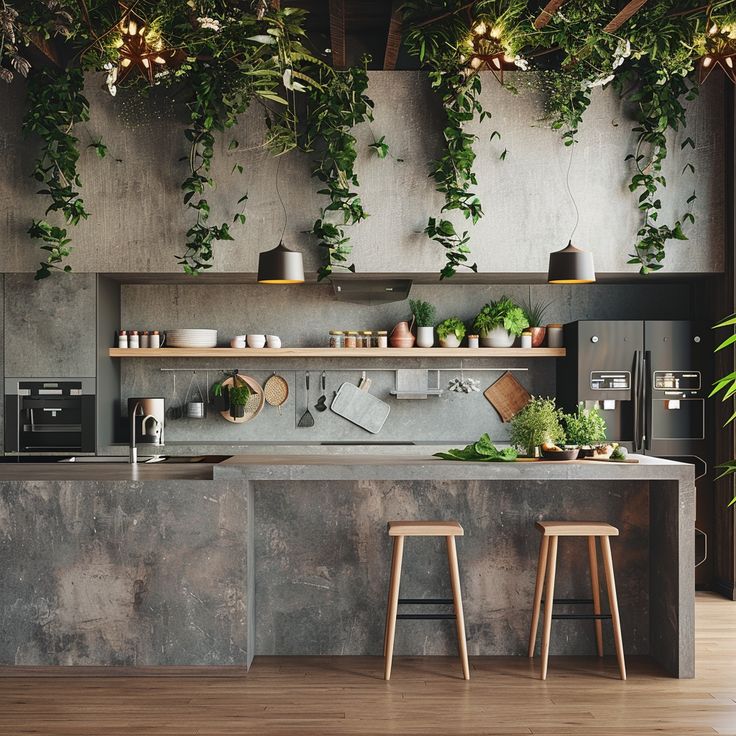 Plants bring life and softness to an open loft kitchen. Tall potted plants, hanging greenery, or small herb gardens on shelves make the kitchen feel fresh, lively, and warm.