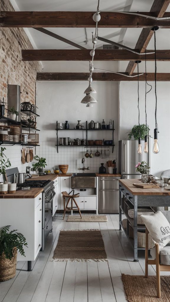 Layering a small rug or runner near the sink or prep area adds warmth underfoot and softens the industrial feel of concrete or wood floors.