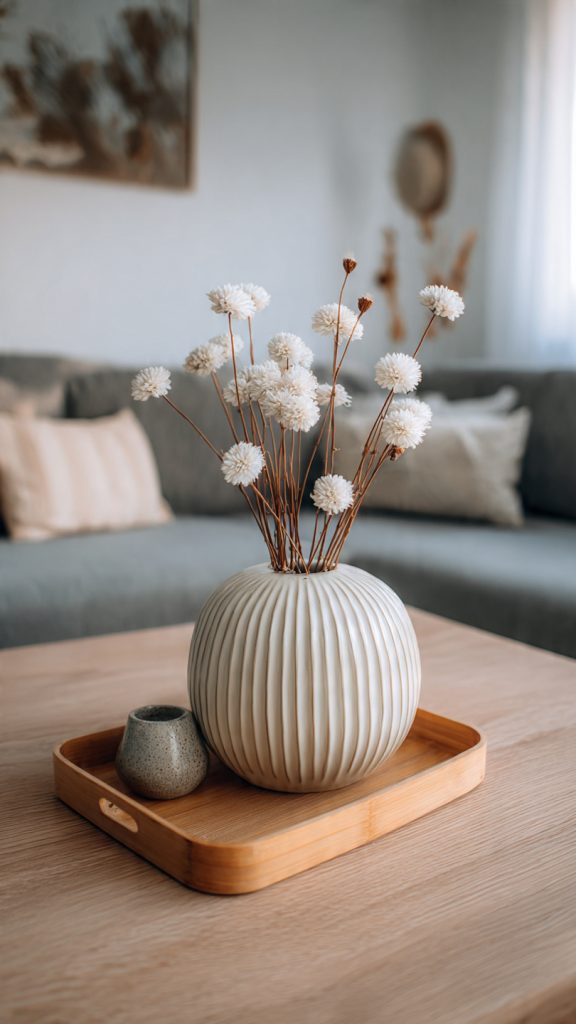 Limit accessories to a few well-chosen pieces such as a ceramic vase, a wooden tray, or a single decorative object.