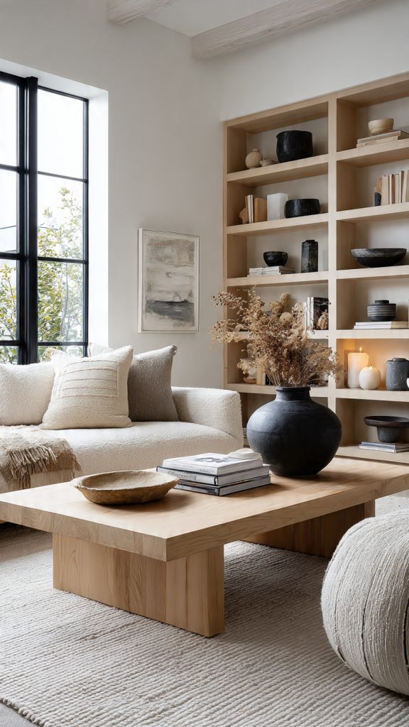 Incorporate wood through coffee tables, shelving, or beams, but stick to straightforward shapes and smooth finishes.