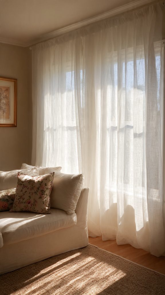 Use sheer curtains, light linen panels, or simple shades instead of heavy drapery.