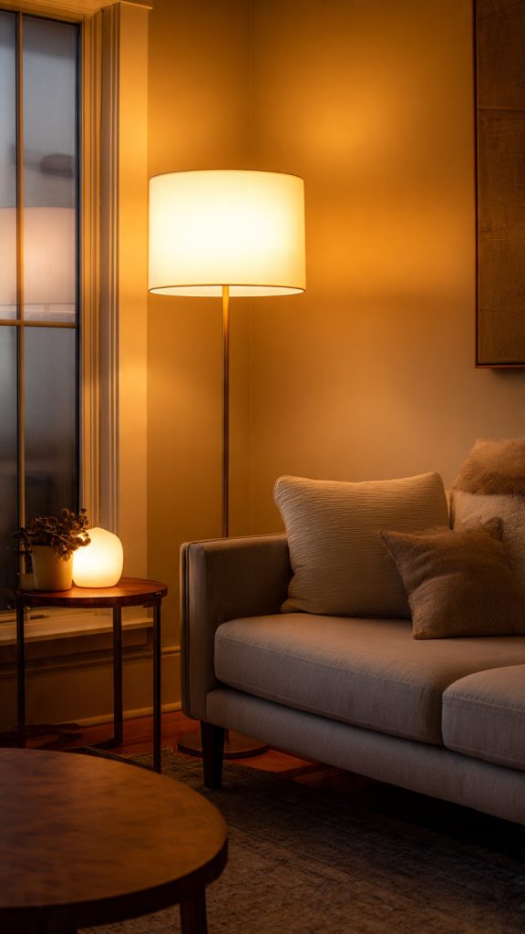 Choose lighting fixtures with clean shapes and warm bulbs, such as simple floor lamps or understated ceiling fixtures.