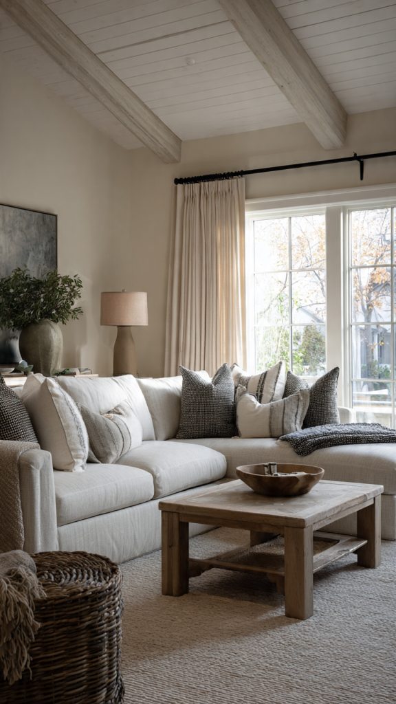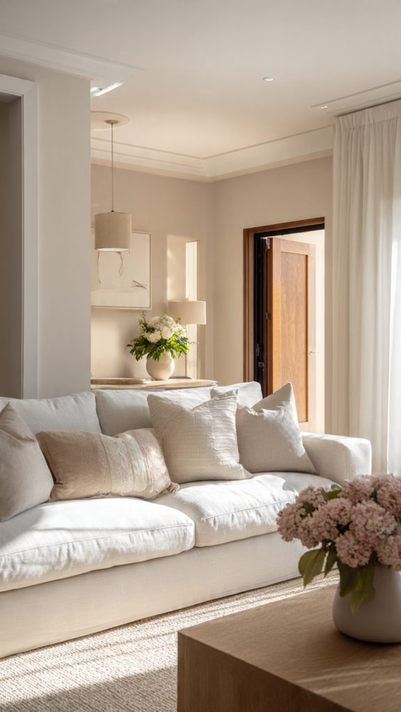 Use soft whites, warm beiges, and light greige tones on walls and large furniture pieces. These colors set a calm foundation and keep the living room feeling open and fresh.
