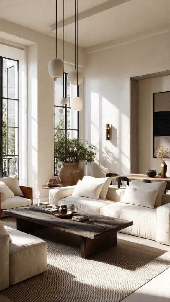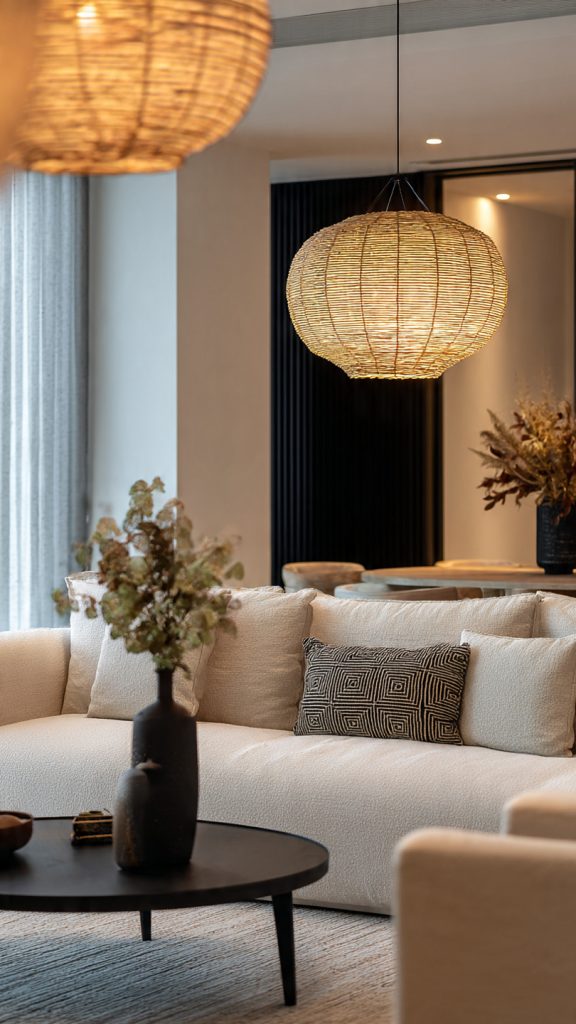 Woven pendant lights, ceramic lamps, and understated sconces are popular choices. Harsh overhead lighting is avoided in favor of warm glows that enhance textures and colors.