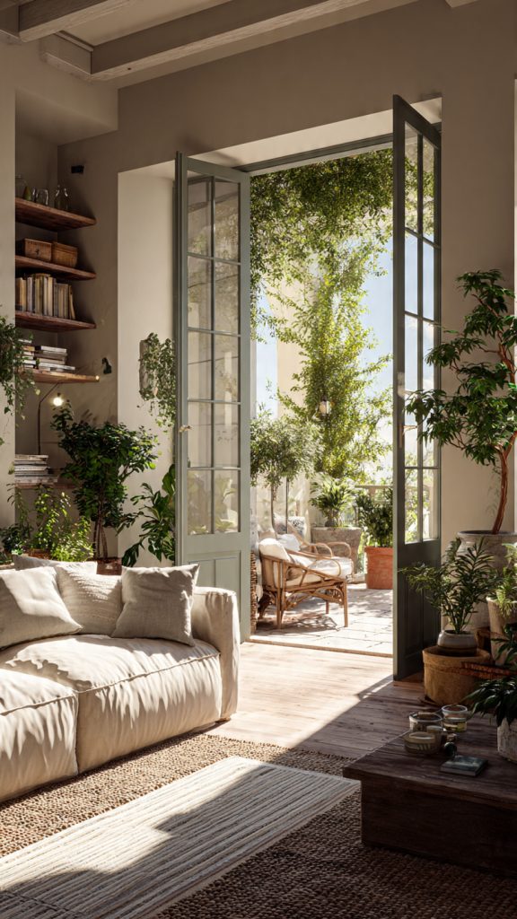 Mediterranean living is closely tied to nature, and modern living rooms often blur the line between indoors and outdoors. Large doors, open windows, or visible terraces enhance this connection.